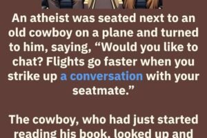 An atheist was seated next to an old cowboy on a plane and turned to him, saying, “Would you like to chat? Flights go faster when you strike up a…